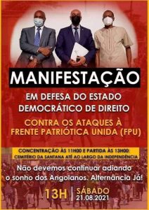 Onze organizações da sociedade civil convocaram, à nível nacional e na diáspora, uma manifestação que irá decorrer, em Luanda, neste sábado, 21, a partir das 13h, “Em Defesa do Estado Democrático de Direito em Angola”.