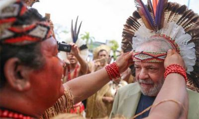 Os índios brindaram Lula com um cocar vistoso e despejaram a fumaça da proteção sobre seu corpo