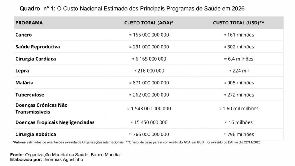 Os valores estimados para 2026 mostram que os nove programas prioritários de saúde exigiriam montantes muito superiores ao que hoje se investe. O Quadro n.º 1 revela que o custo nacional total necessário para esses programas ultrapassa vários biliões de kwanzas. Apenas três exemplos ilustram a magnitude: