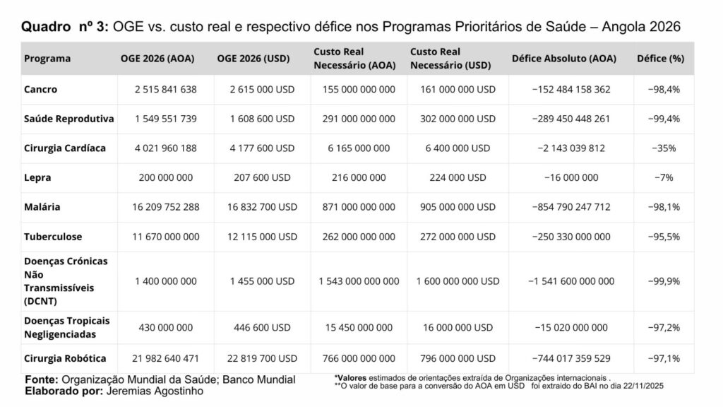 Para financiar estes programas de forma minimamente adequada em 2026, o orçamento da função saúde deveria subir para pelo menos 6 biliões AOA, ou seja, triplicar o valor atual.