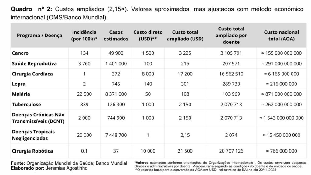 Estes valores foram calculados com base nas incidências ajustadas por 100 mil habitantes, nos custos diretos por doente e na ampliação económica recomendada pela OMS e Banco Mundial — metodologia detalhada no Quadro n.º 2. Esta análise demonstra que não se trata de projeções arbitrárias, mas de resultados sustentados em evidência epidemiológica.